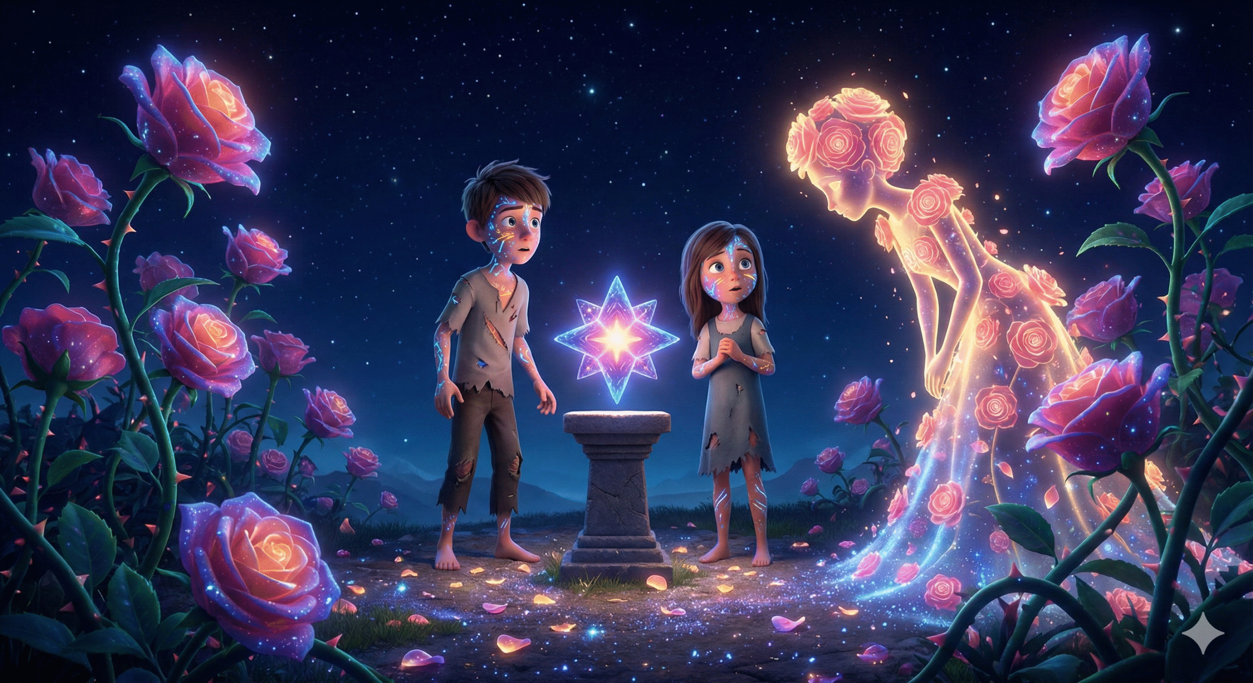 На запястьях детей появились тонкие браслеты из света — следы от шипов роз.