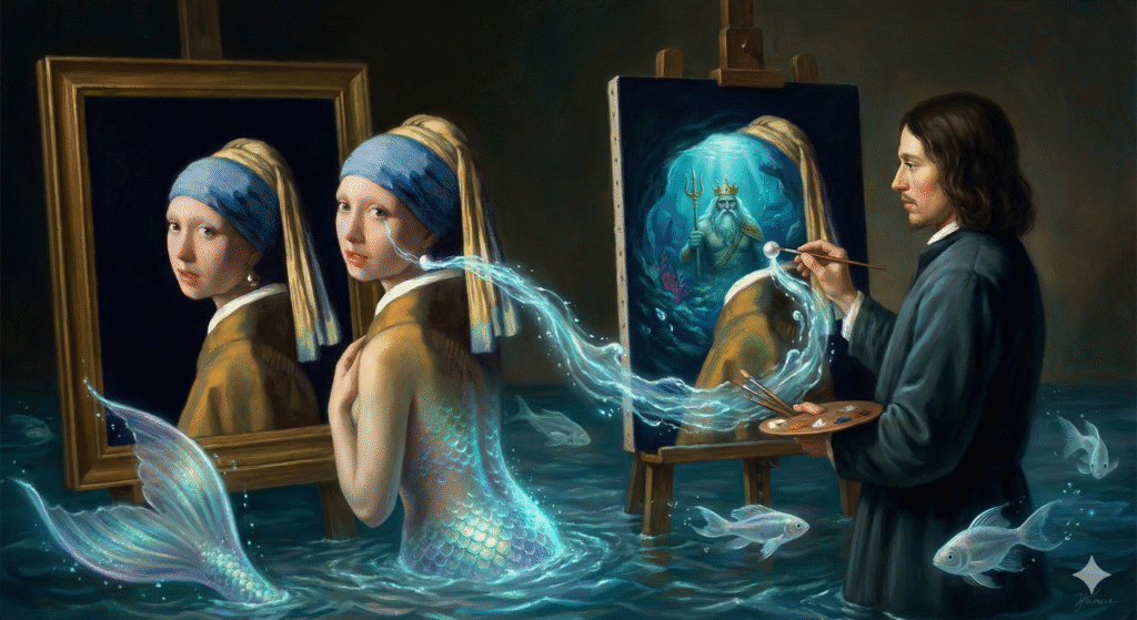 — Твой отец смягчился! Но с условием! Приведи человека, который напишет ПРАВДИВЫЙ портрет русалки! Не монстра, не богини — просто девушки из моря! Тогда проклятие спадёт!