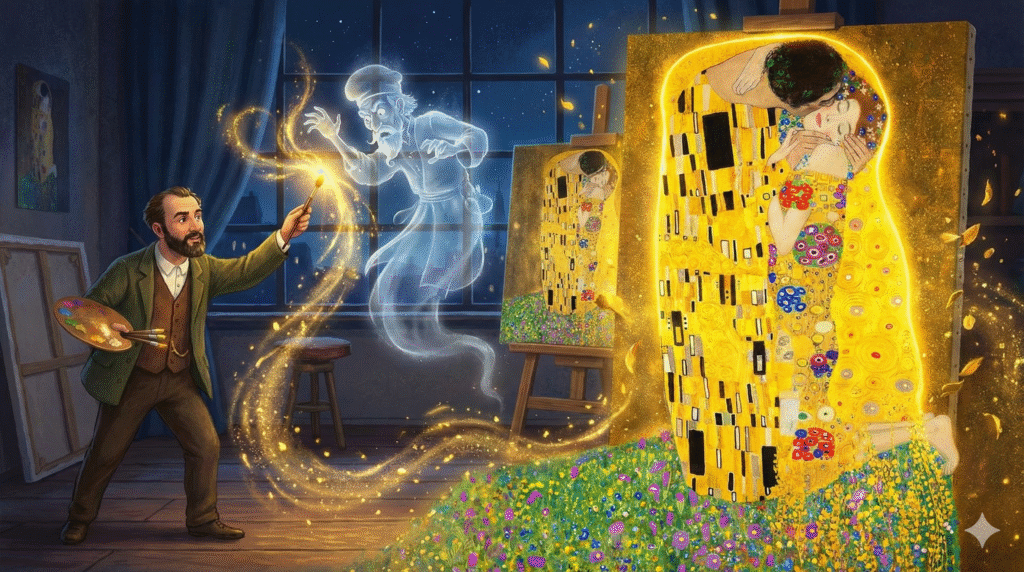 Они вернулись на холст, но теперь были счастливы! Золото больше не сковывало — оно стало их праздничной одеждой!