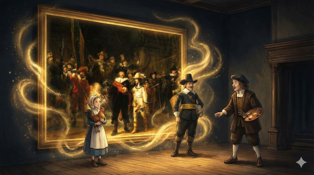И тут из картины выпорхнула ДЕВОЧКА с курицей на поясе — таинственная фигура, которую Рембрандт добавил для символизма.
