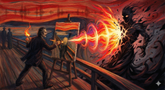 “Ха! Художник и плакса! Что вы можете против моей силы? Я питаюсь грустью людей! Чем печальнее мир, тем сильнее я становлюсь!”