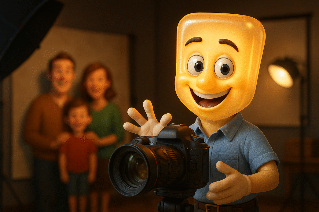 ВСПЫШКА! Яркий импульсный свет залил студию. Семья замерла в улыбках — щёлк, готово.