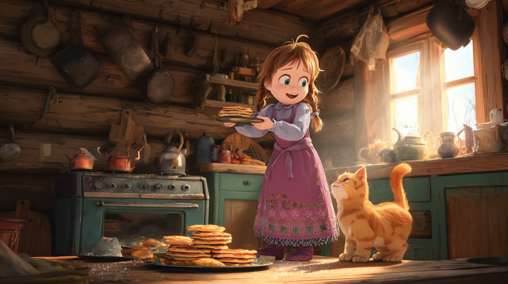 Вечером Маша сидела на крыльце. Солнце садилось за лес, окрашивая всё в золотой и розовый. Кот Васька мурлыкал на коленях. Из избы пахло вечерним молоком и свежим хлебом.