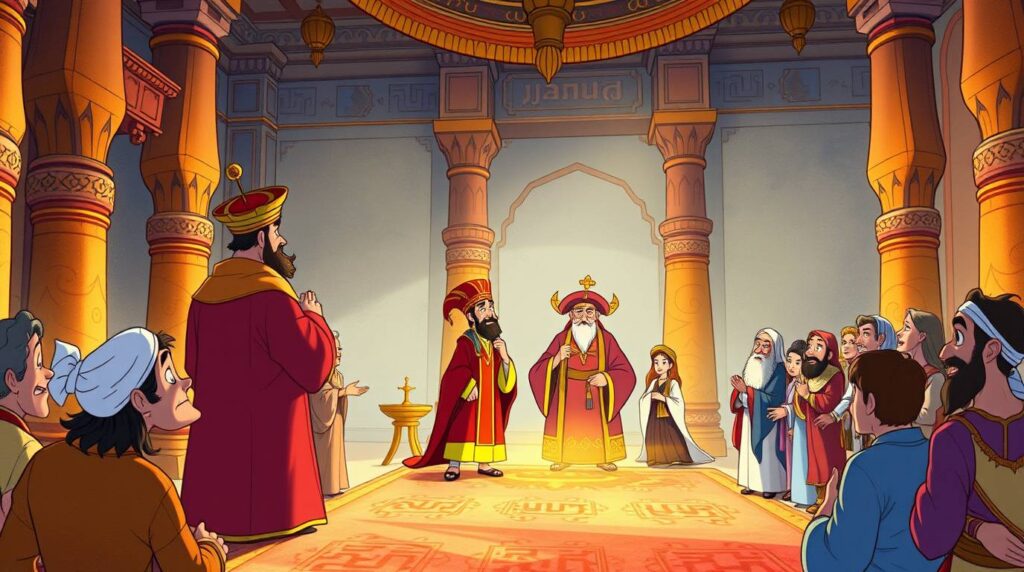 Но вот беда — во дворце завелось много обманщиков. Визирь врал про налоги. Казначей воровал из казны. Даже повар утверждал, что на царский стол идёт сто баранов в день, а сам половину домой уносил!