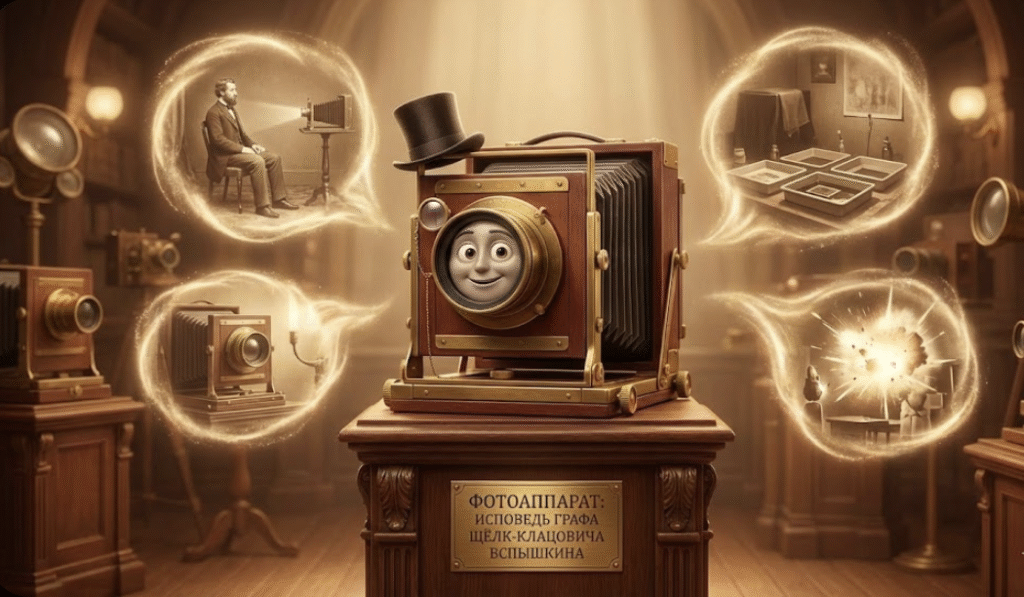 В музее изобретений, в бархатной витрине под пуленепробиваемым стеклом, просыпается древний дагерротипный фотоаппарат – массивный деревянный ящик с медной линзой, похожий на одноглазого циклопа в смокинге.