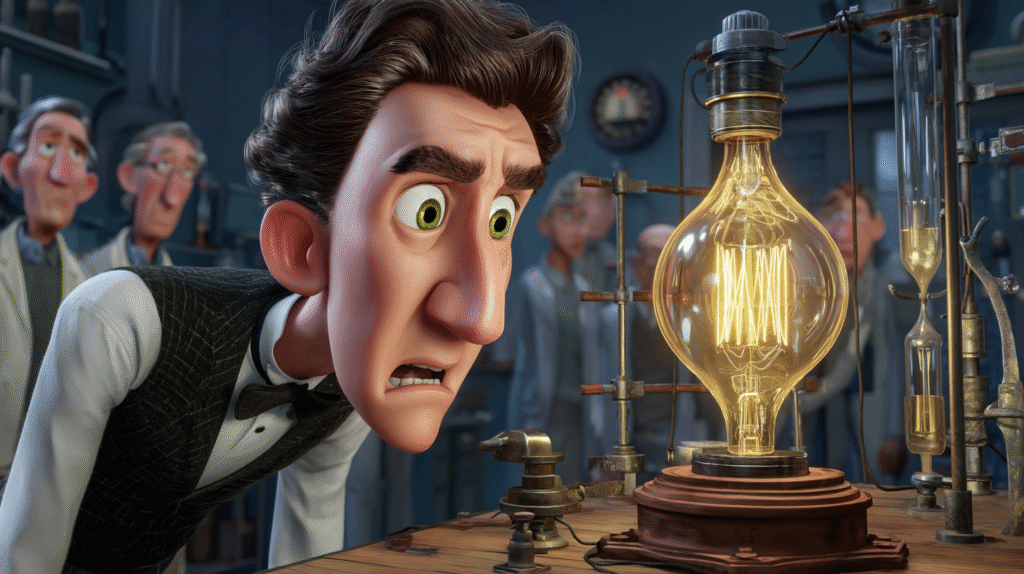 “О, привет, солнышко! Да-да, ты, не оглядывайся! Подойди ближе к моему тёплому свечению. Я – Лампочка Люмина, первая электрическая звезда, прогнавшая ночь из человеческих домов! Видишь мою углеродную нить? Она похожа на волосок, но этот волосок горел 1200 часов подряд в 1879 году и изменил мир навсегда!