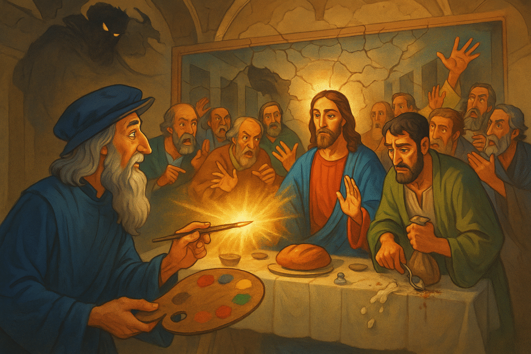 Третий год Леонардо да Винчи расписывал стену в трапезной монастыря Санта-Мария-делле-Грацие. Огромная фреска — 4 метра в высоту! — была почти готова. Поздний вечер. Леонардо работал при свечах, дописывая последние детали. Он отошёл на несколько шагов, чтобы оценить работу, и вдруг… ГРОХОТ! Землетрясение! В Милане?! Невозможно! Но стены задрожали, свечи упали, и по фреске пошла ТРЕЩИНА — прямо через всю композицию! — Нет! Моя работа! — Леонардо бросился к стене. Трещина светилась изнутри странным золотым светом. И вдруг из неё посыпались… слова? Золотые буквы витали в воздухе: “ОДИН ИЗ ВАС ПРЕДАСТ МЕНЯ” Буквы закружились вихрем и ударили в фреску. Все тринадцать фигур вздрогнули, закашляли и… ОЖИЛИ! — Что?.. Где мы?.. — апостолы в замешательстве слезали со стены. Но что-то было не так. Их глаза были пустыми. Христос посмотрел на них с печалью: — Проклятие сработало. Древнее проклятие забвения. Я только что сказал: “Один из вас предаст меня”. Но проклятие стёрло память о том, КТО это будет. Даже я не помню.