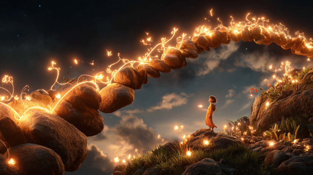 Над пропастью висели осколки моста. Не соединённые, а парящие отдельно друг от друга — каменные плиты, светящиеся изнутри мягким жемчужным светом. Между ними — пустота, в которой кружились искры, похожие на светлячков.