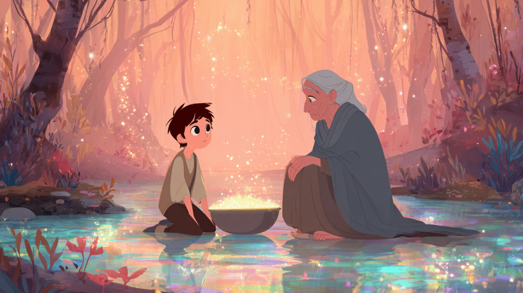 Лио наклонился к реке, зачерпнул воды. Чаша наполнилась не просто водой — жидким светом, который переливался всеми цветами радуги.
